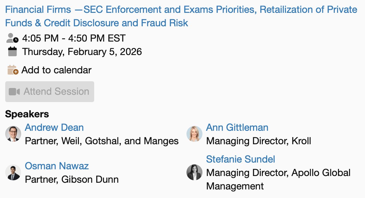 Securities Enforcement Forum New York 2026 is set for Thursday, February 5, 2026 at the historic JW Marriott Essex House! Join us in person or tune in virtually to hear from nearly 50 luminaries in the securities enforcement field—including numerous senior officials from the SEC and DOJ, in-house counsel from major corporations, and lawyers and consultants from the best firms and in the world.