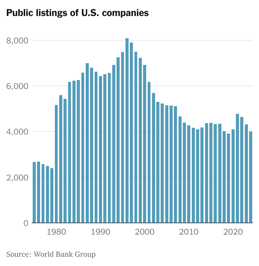 Despite a soaring stock market, an increasing number of executives seem to share Chen’s philosophy: The number of U.S. public listings dropped from a peak of 8,090 in 1996 to 4,010 last year, according to data from the World Bank.